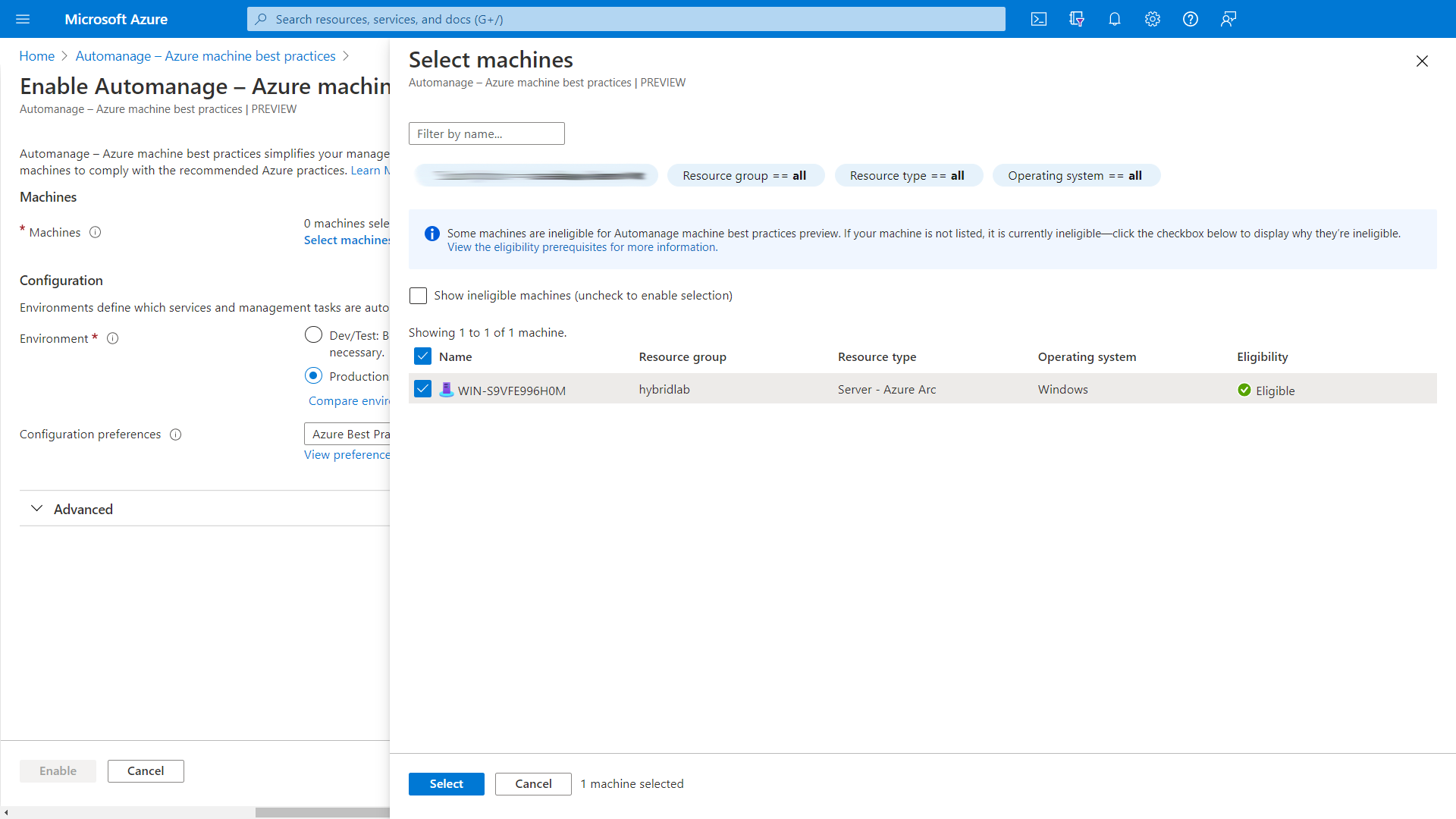 When you click on that you will be presented with several options. The first one is what machines you want to enable Automanage for. In this example I am going to select one of my on-prem servers that are connected through Azure Arc.