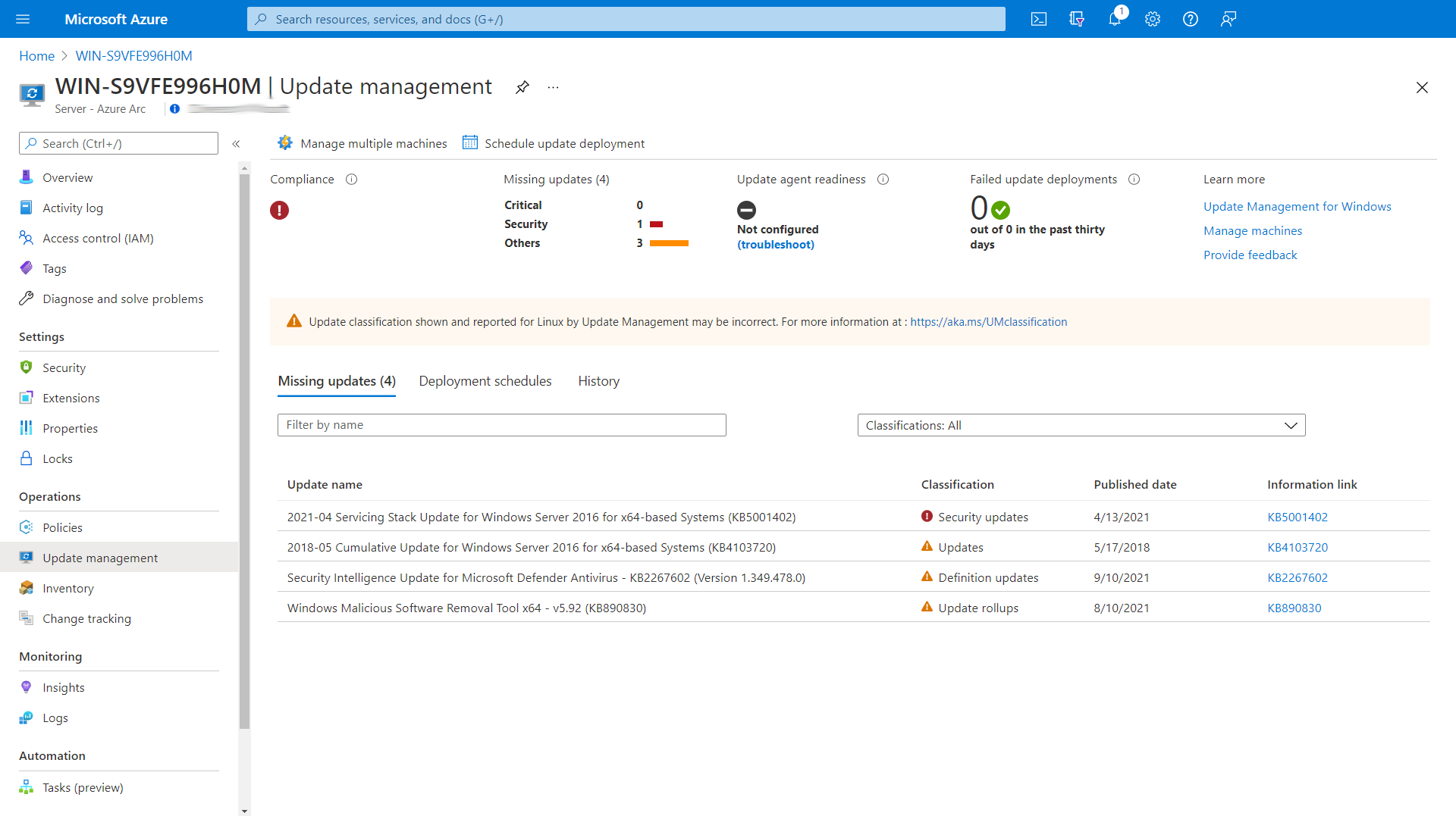 It may take some time for things to kick and fully start to report and show within the Azure portal but one of the first things that has started to report for me is that my server is missing some updates. And I can start to schedule deployments of updates to bring it up to date and keep it up to date.
