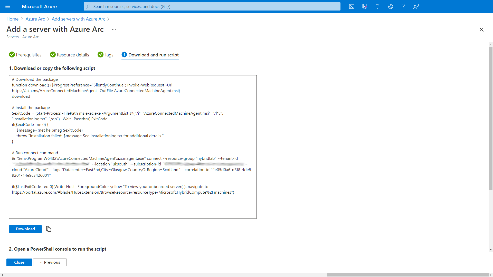 The script will run and install the necessary components to install Azure Arc on your server. At one stage it will ask you to open a browser to https://www.microsoft.com/devicelogin and authenticate to your Azure subscription.